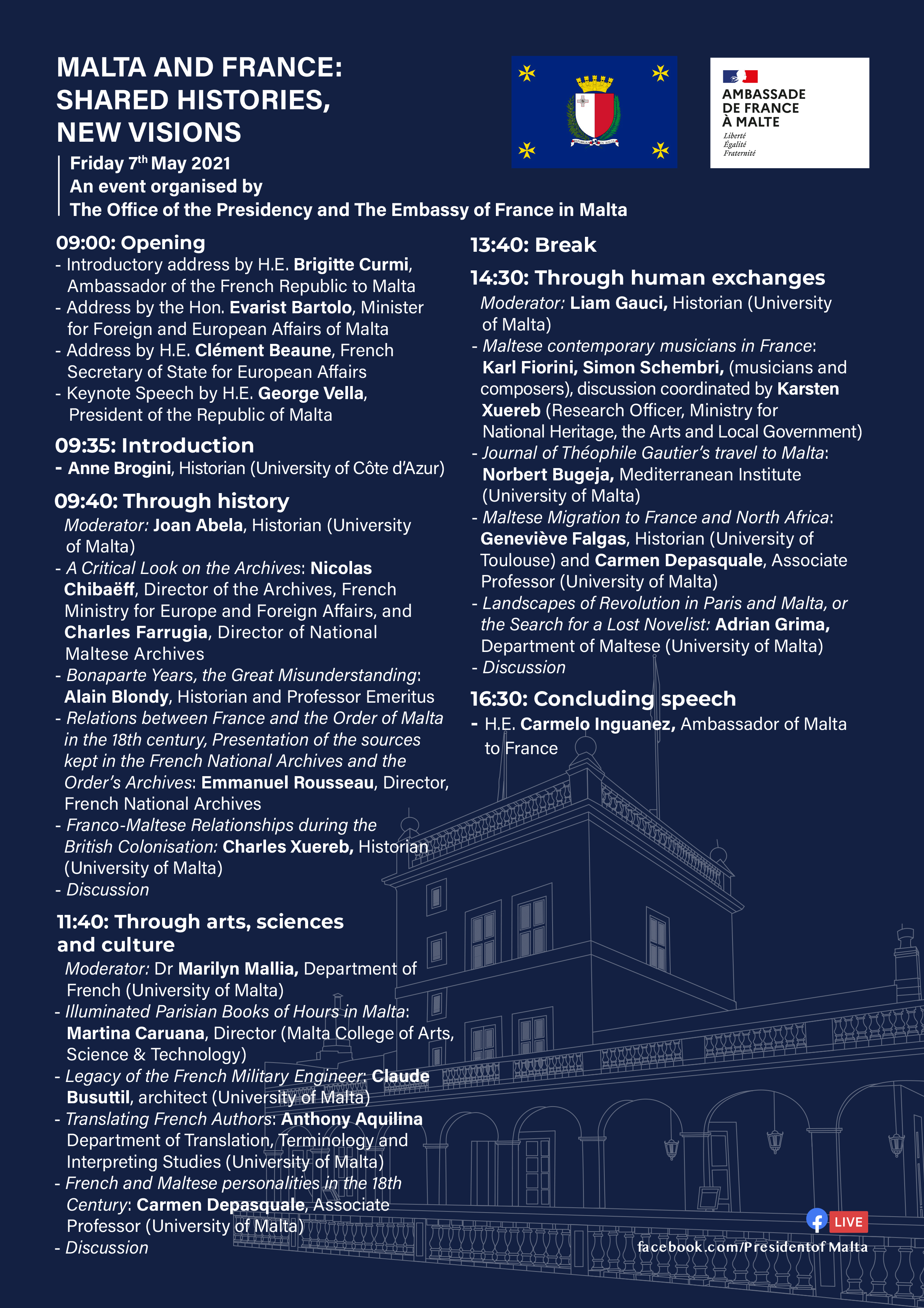 This International Symposium on Malta and France: Shared Histories, New Visions will be broadcast on the Facebook page of the President of the Republic https://www.facebook.com/PresidentofMalta and on Zoom at https://zoom.us/j/96770304050…. Meeting ID: 967 7030 4050 | Passcode: 217921