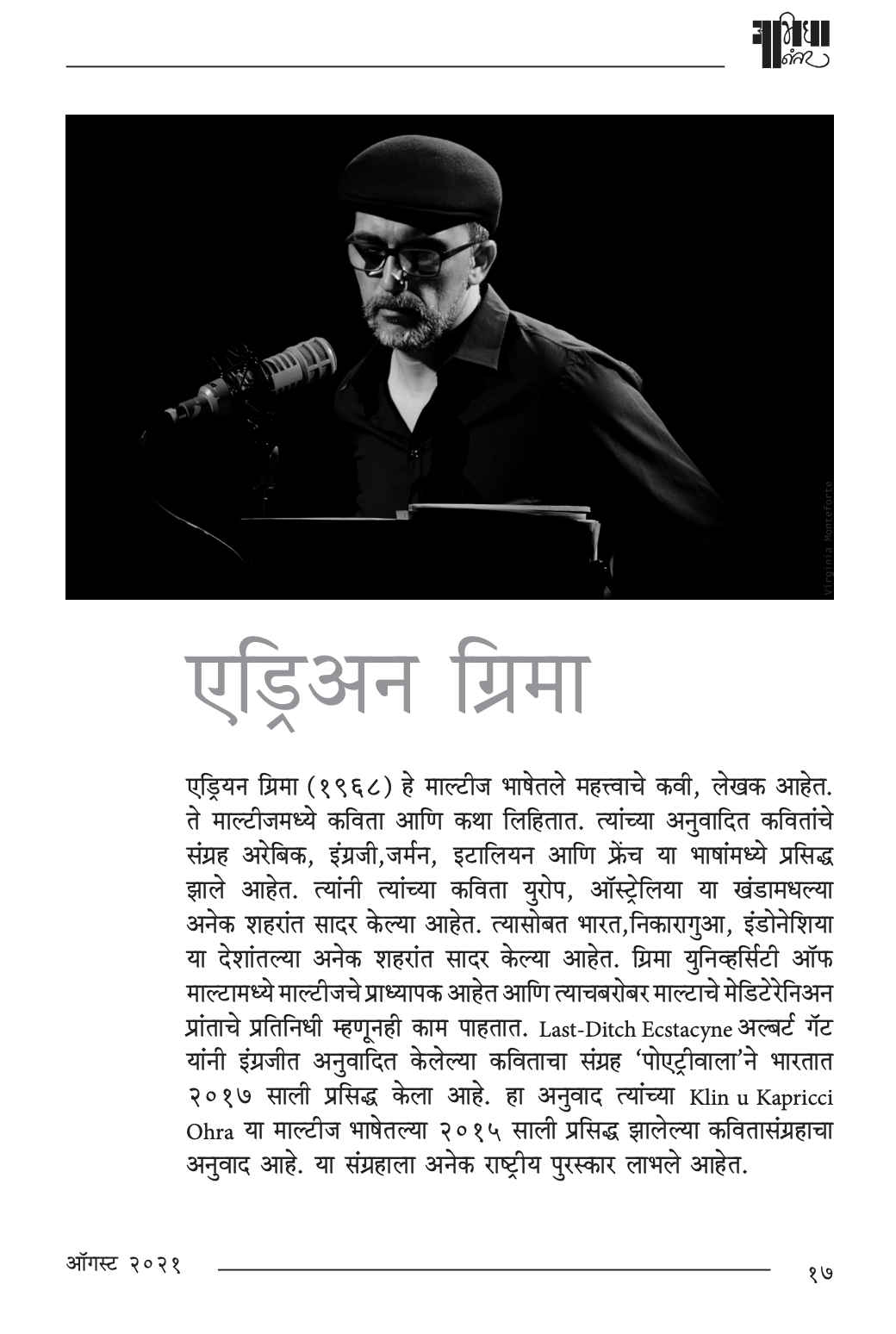 The Indian Marathi poet, editor, publisher, translator and poetry activist Hemant Divate has published two of my poems he translated into Marathi in the first issue of the relaunched literary magazine Abhidha Nantar published in Mumbai. The poems were translated from the English versions by Albert Gatt but we discussed them in person during a poetry translation workshop in Mumbai in November 2016 organized by Literature Across Frontiers. We also performed our poems and the translations we made of each other’s poems on stage of the NCPA – Little Theatre at the Tata Literature Live – The Mumbai LitFest.
