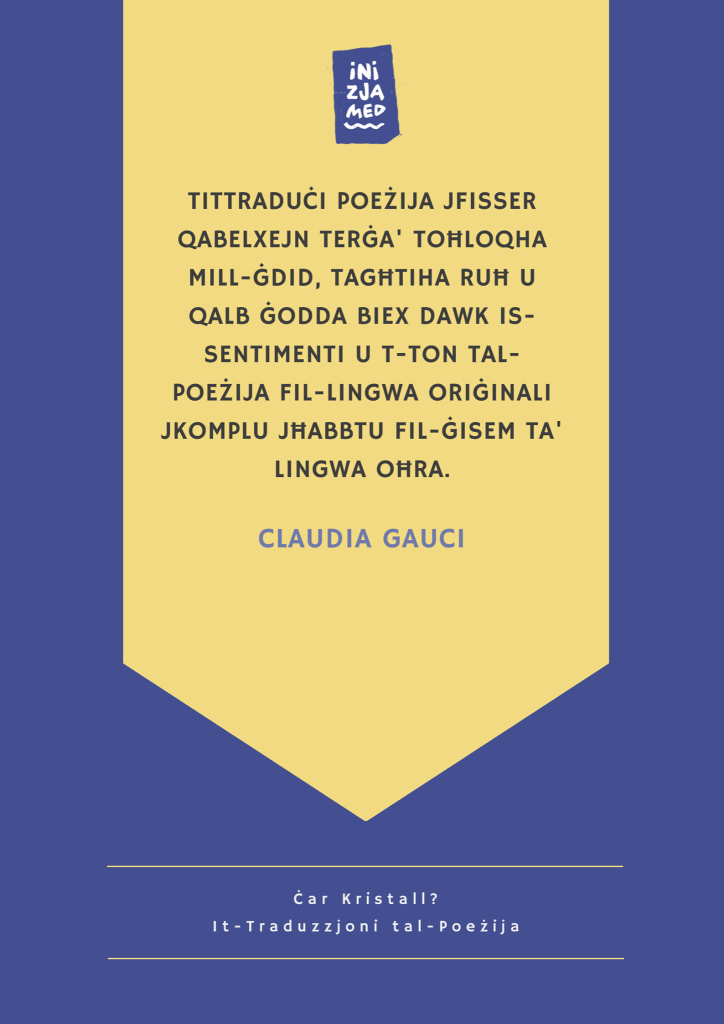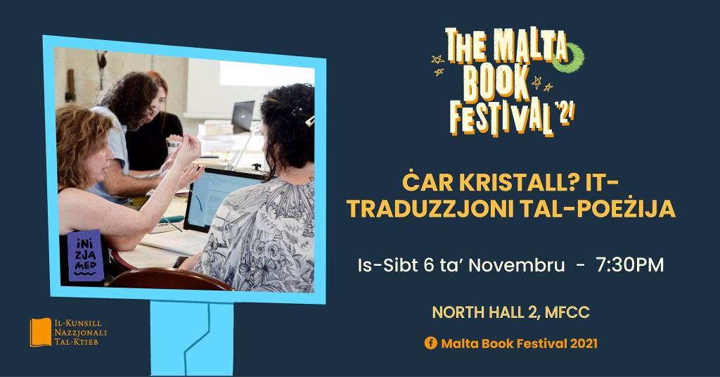 Nhar is-Sibt, 6 ta’ Novembru 2021, fis-7.30pm f’North Hall 2 tal-MFCC, Ta’ Qali, Inizjamed se torganizza attività bl-isem ta’ “Ċar Kristall? It-Traduzzjoni tal-Poeżija” bħala parti mill-Festival Nazzjonali tal-Ktieb. Ħajr lill-organizzaturi tal-istedina. Minbarra li t-traduzzjoni tal-poeżija hija l-iktar qari profond tax-xogħol oriġinali, għandha wkoll sehem ewlieni fl-iżvilupp tal-kitba ta’ ħafna poeti. Ara din il-paġna dwar dan l-avveniment fuq Facebook.