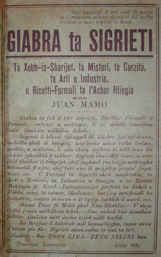 Fis-snin 20 Juann Mamo ħareġ sensiela ta’ artikli li wara ppubblikahom fi ktieb bl-isem ta’ Ġabra ta’ Sigrieti. Fost dawn is-sigrieti Mamo jikteb dwar ħxejjex li wieħed għandu jikkonsma biex ifejjaq ċertu mard u problemi ta’ saħħa. Fost oħrajn isemmi l-weraq tal-ful, id-dekot tal-weraq taż-żebbuġ, il-weraq taċ-ċappiża, il-fejġel, il-ħurrieq, il-fidloqqom, u l-ħaxixa Bużbula.