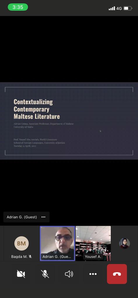 On Tuesday 13th April 2022 I was invited to give a lecture on Contextualising Contemporary Maltese Literature to Ph.D students of English at the University of Jordan. The lecture was part of a study unit on World Literature delivered by Prof. Yousef Abu Amrieh. It was my friend and colleague Dr Giuliana Fenech from the Department of English at the University of Malta who put Prof. Abu Amrieh in touch with me.