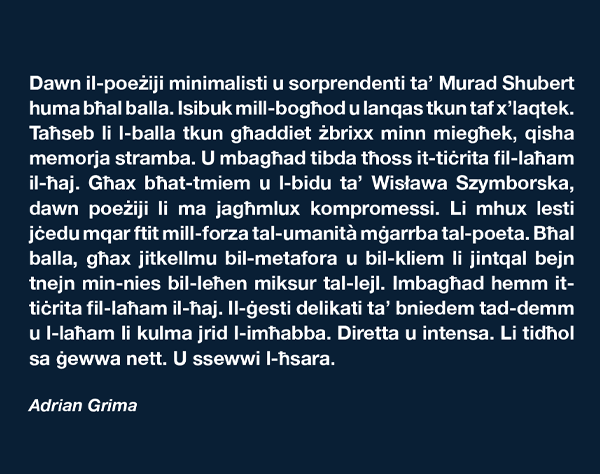 Dawn il-poeżiji minimalisti u sorprendenti ta’ Murad Shubert huma bħal balla. Isibuk mill-bogħod u lanqas tkun taf x’laqtek. Taħseb li l-balla tkun għaddiet żbrixx minn miegħek, qisha memorja stramba. U mbagħad tibda tħoss it-tiċrita fil-laħam il-ħaj. Għax bħat-tmiem u l-bidu ta’ Wisława Szymborska, dawn poeżiji li ma jagħmlux kompromessi. Li mhux lesti jċedu mqar ftit mill-forza tal-umanità mġarrba tal-poeta. Bħal balla, għax jitkellmu bil-metafora u bil-kliem li jintqal bejn tnejn min-nies bil-leħen miksur tal-lejl. Imbagħad hemm it-tiċrita fil-laħam il-ħaj. Il-ġesti delikati ta’ bniedem tad-demm u l-laħam li kulma jrid l-imħabba. Diretta u intensa. Li tidħol sa ġewwa nett. U ssewwi l-ħsara.