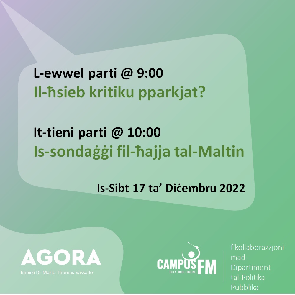 Il-programm “Agora” jittella’ minn Dr Mario Thomas Vassallo bil-għajnuna tad-Dipartiment tal-Politika Pubblika fl-Università ta’ Malta.