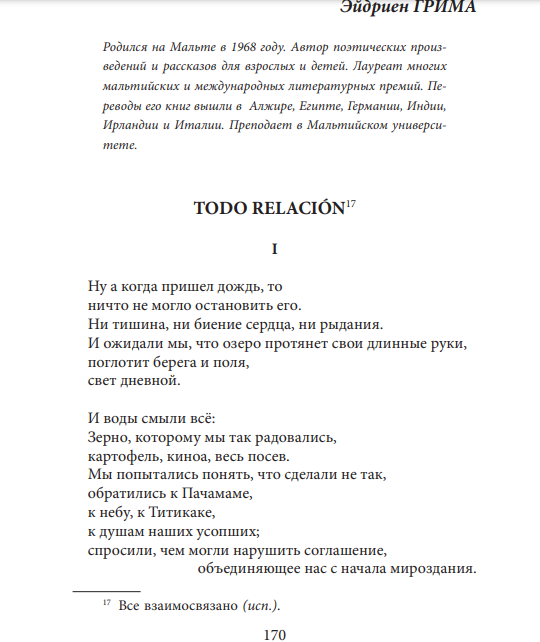 F’ħarġa tal-almanakk letterarju СОЗВУЧИЕ (li tlissinha “Sożvuċie”) li tnediet waqt il-XXX Fiera Internazzjonali tal-Ktieb fil-belt kapitali tal-Belarussja f’Marzu ta-2023, ħarġet it-traduzzjoni għar-Russu minn Yana Psaila (fir-ritratt) tal-poeżija tiegħi “Todo Relacion.”