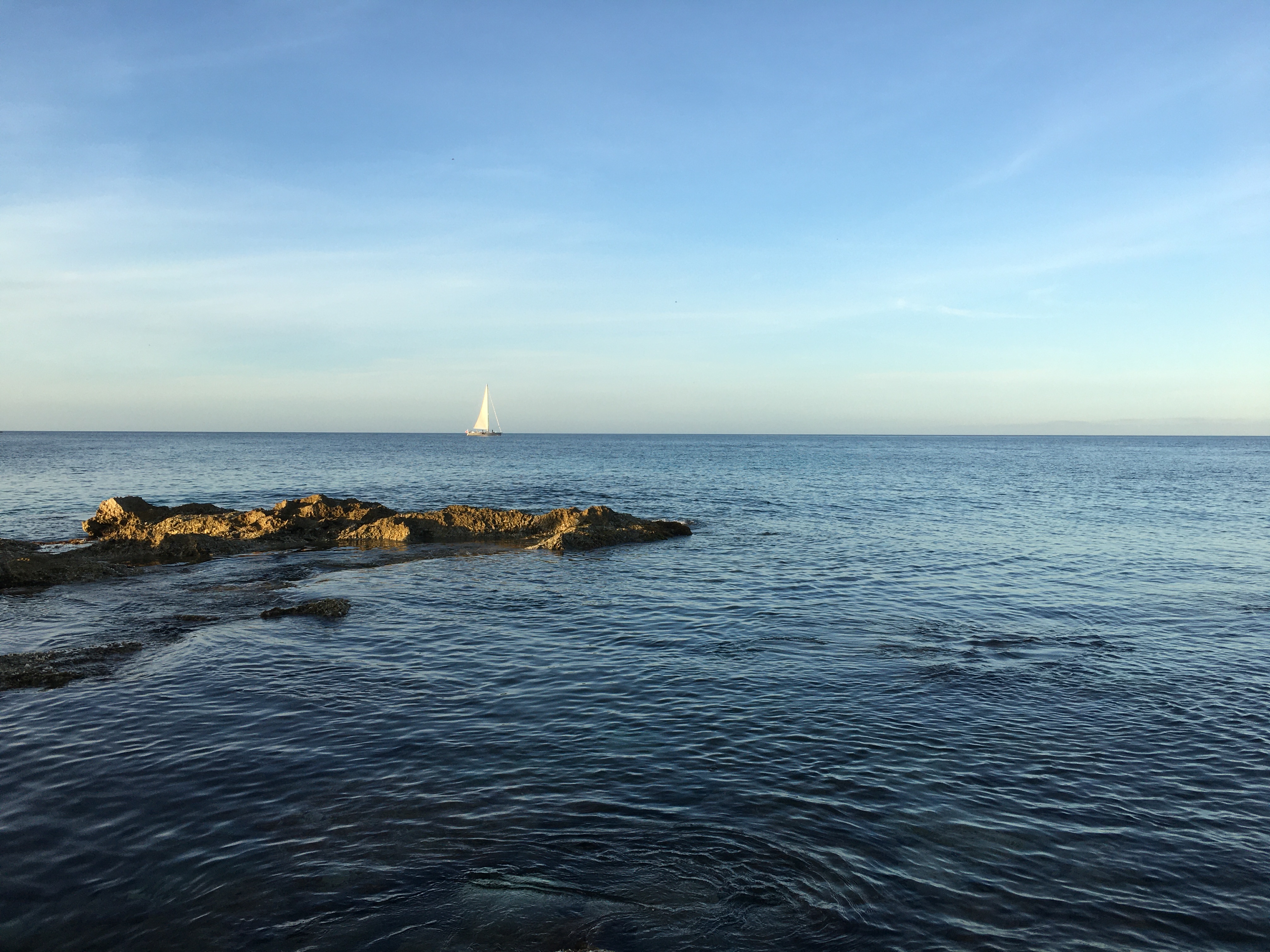 Hemm dgħajsa tal-qlugħ ġejja lejna min-naħa ta’ fuq. Spettaklu waħedhom dawn il-qlugħ. Ma tantx għandhom riħ fiex jixxalaw il-qlugħ, imma jidhru stirati u d-dgħajsa tidher miexja bil-pass tagħha. Aktarx miexja aktar milli tidher minn din il-qala. Ġieli jgħaddu qatgħat sħaħ ta’ dgħajjes tal-qlugħ fis-sajf, qlugħ bojod li mix-xatt jidhru nodfa tazza, qishom liżar li għadu kemm tgħalla u ntaxar. Dan tal-lum qala’ jagħti fil-griż. Ċar imma jagħti fil-griż.
