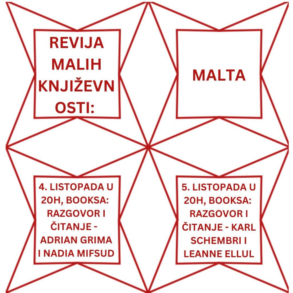 In early October 2023 I was invited to an annual festival in Zagreb hosted by Booksa called Review of Small Literatures. This year the festival had a special focus on Malta and I was asked by Booksa to make the selection of Maltese writers. Originally the organizers planned to translated eight writers representing different generations and genres and I followed this criterion to identify the Maltese writers. Eventually, from that initial list, the organizers decided to focus on five poets: Leanne Ellul, Gioele Galea, Nadia Mifsud, Karl Schembri, and Murad Shubert.