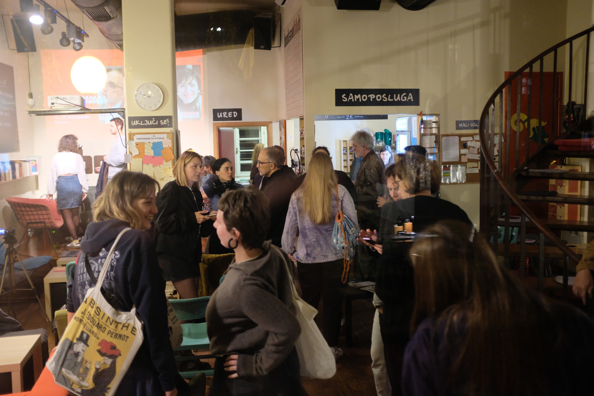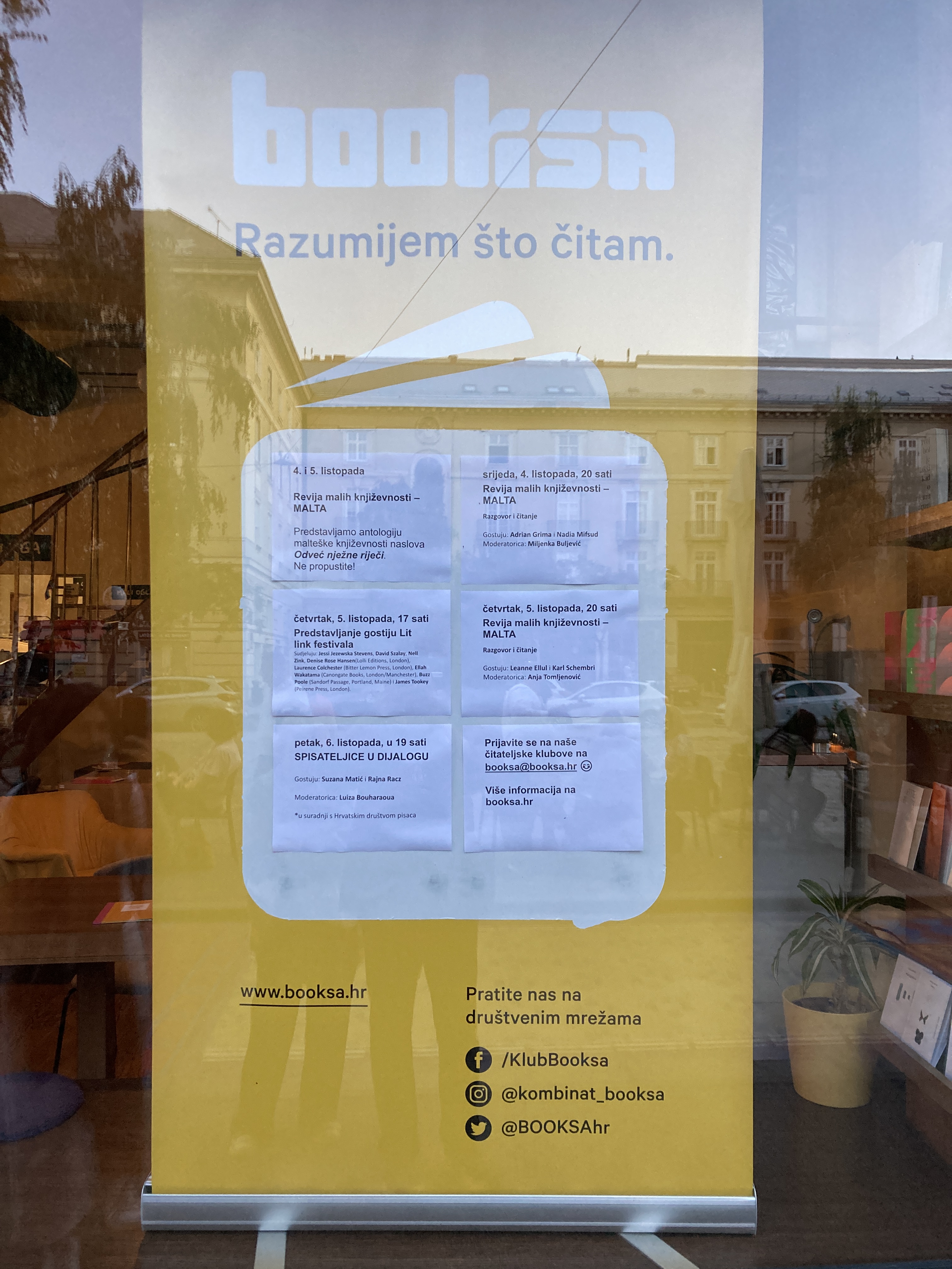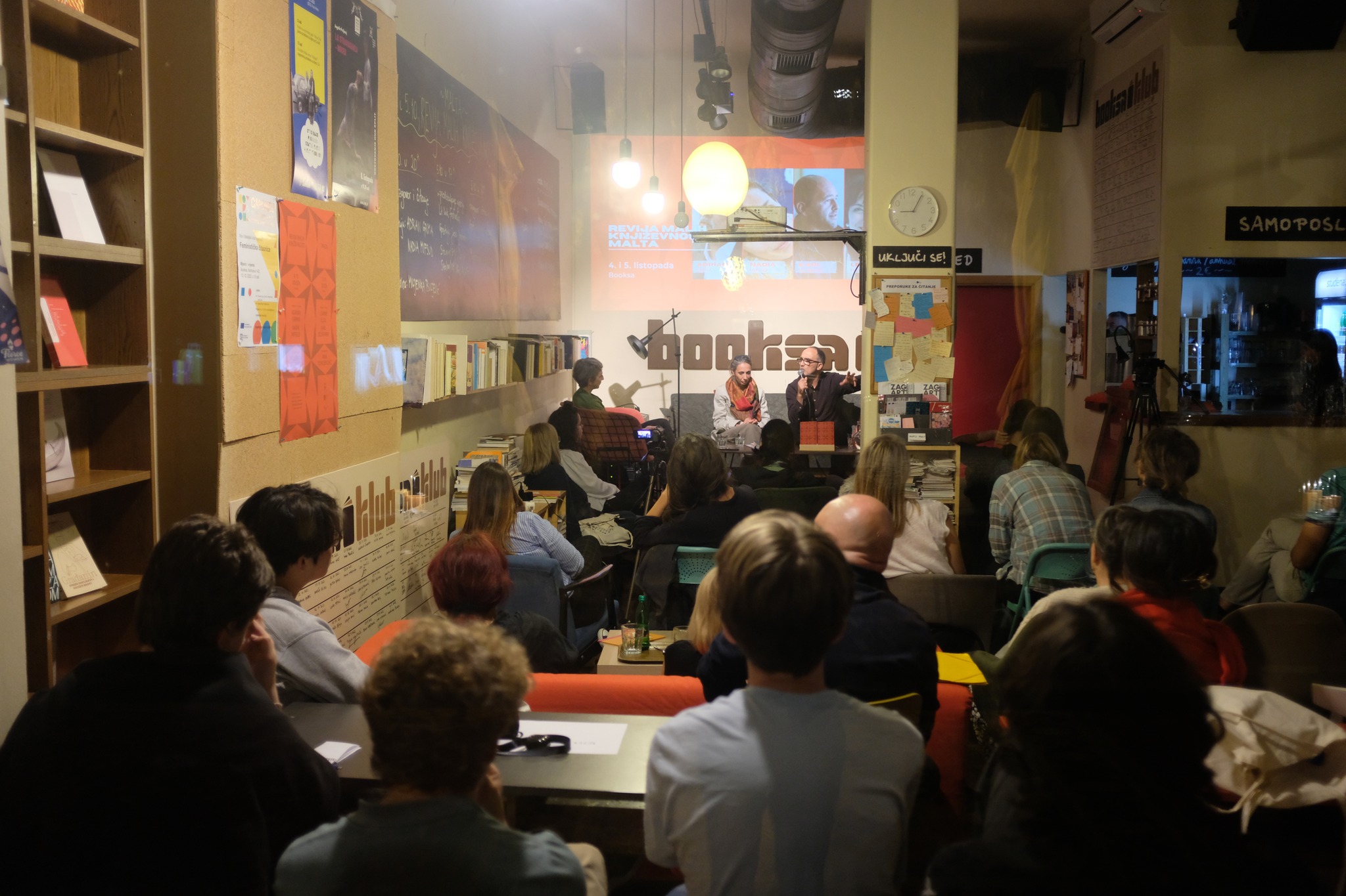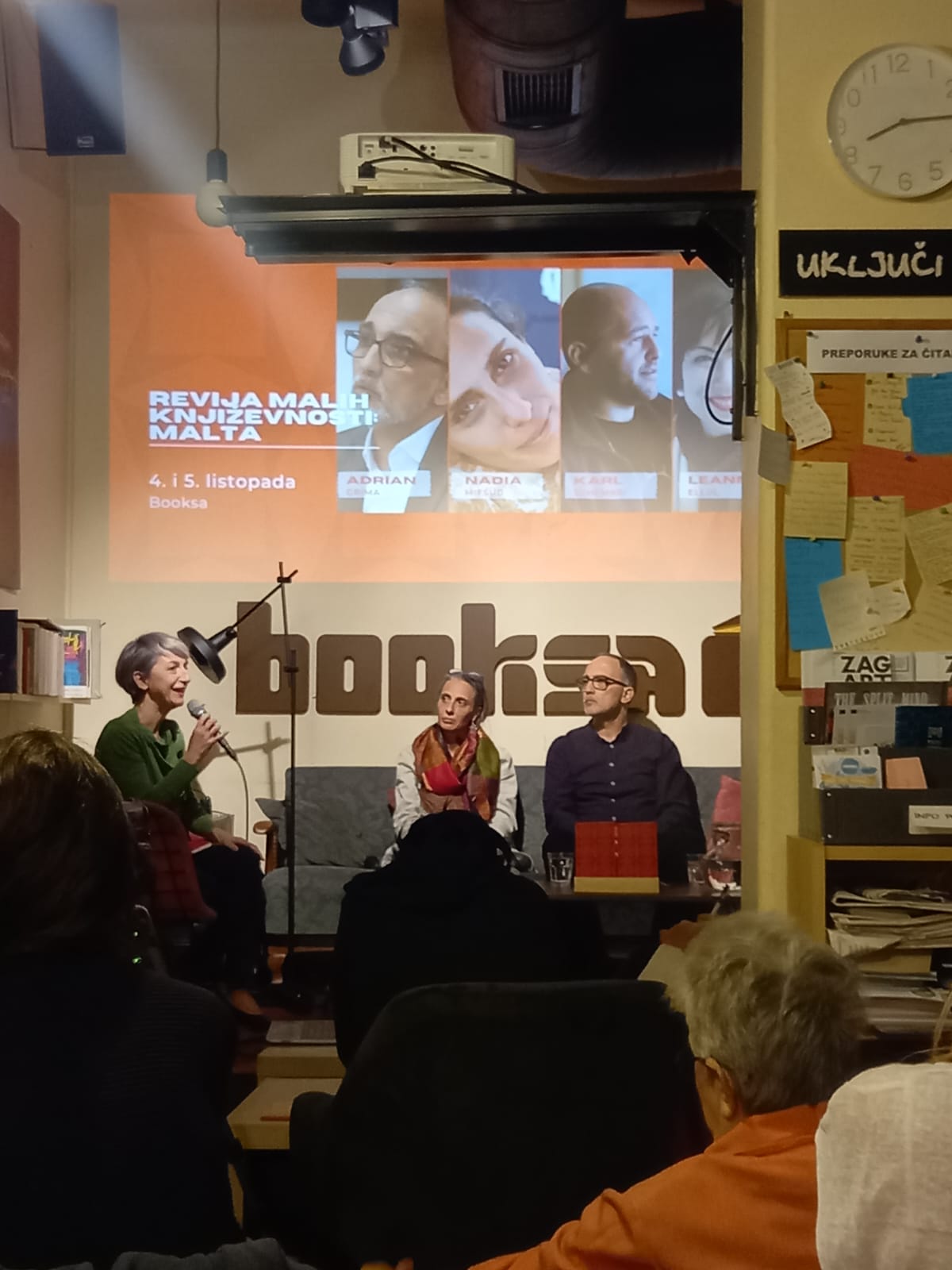Gioele and Murad could not travel to Zagreb, so the two public events of the festival, held at the charming centre of Booksa in the old city centre, featured a discussion and reading with Nadia and myself on Wednesday 5 October at 8.00pm, in which I spoke about my selection and the literary scene in Malta, and read poems by Gioele and Murad; and another discussion and reading by Leanne and Karl on Thursday 6 October at 8.00pm. We spoke in English and read our work mainly in Maltese, with the Croatian translations screened on the wall behind us.