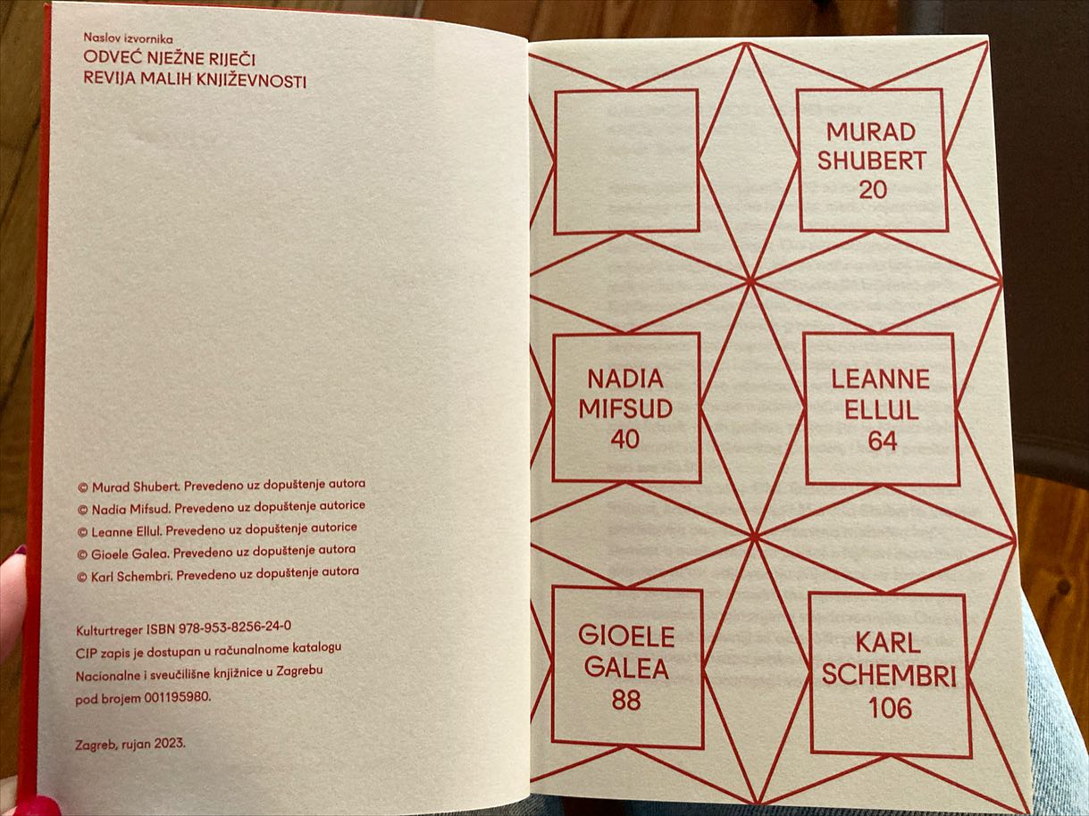 In October 2023 the Croatian association for the promotion of cultures Kulturtreger, published an anthology of contemporary Maltese poetry translated from English into Croatian. The book was launched during the 18th edition of Review of Small Literatures, a festival hosted at Booksa in its charming book lounge in the centre of Zagreb.