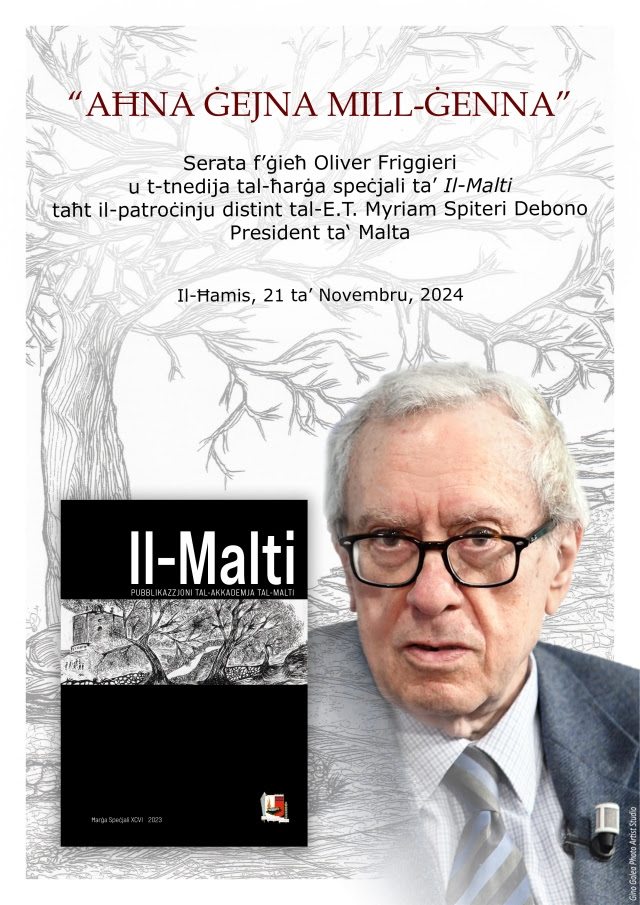 Nhar il-Ħamis, 21 ta’ Novembru 2024 l-Akkademja tal-Malti se tfakkar lill-Prof. Oliver Friggieri fir-raba’ anniversarju minn mewtu (21.11.2020). Il-pubblikazzjoni tiġbor fiha l-atti tal-konferenza preżentati fil-Kunvent tal-Karmelitani fl-Imdina, li kienet ġiet organizzata mid-Dipartiment tal-Malti tal-Università ta’ Malta flimkien mal-Akkademja tal-Malti u l-Istitut Karmelitan fil-5 ta’ Marzu 2022.