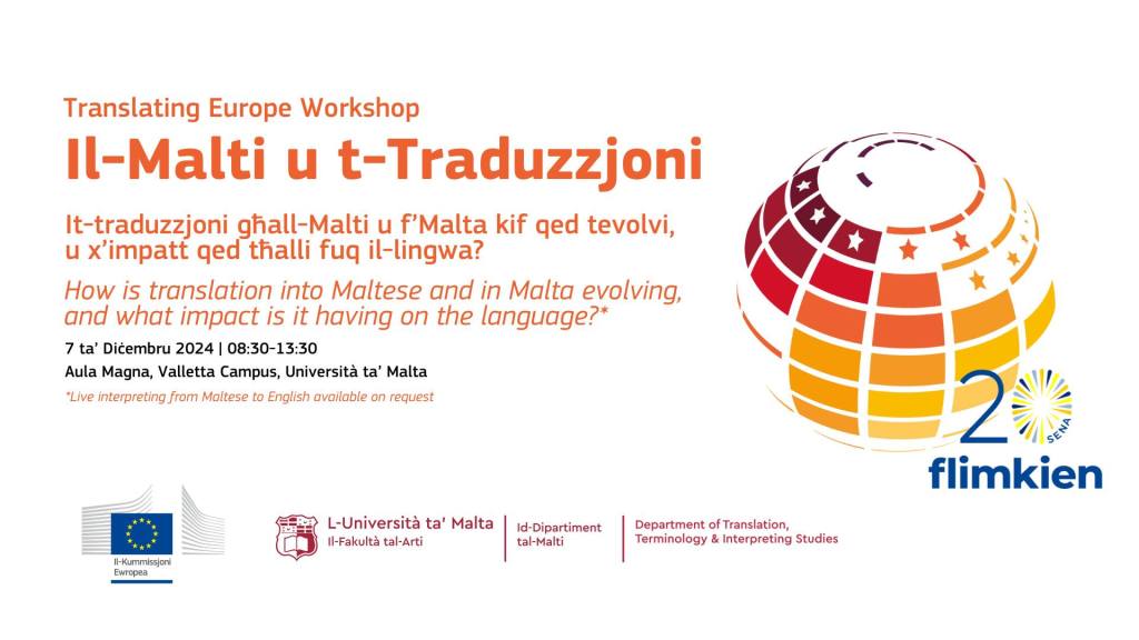 Għoxrin sena wara li l-Malti sar lingwa uffiċjali tal-Unjoni Ewropea, f’din il-konferenza se nirriflettu fuq l-iżvilupp tat-traduzzjoni lejn l-ilsien Malti, kif ukoll l-iżvilupp tal-istudji tat-traduzzjoni. Bis-sehem ta’ akkademiċi u ta’ tradutturi, nixtarru wkoll kif it-traduzzjoni affettwat il-Malti nnifsu, u jkollna l-opportunità li nitgħallmu aktar dwarha permezz ta’ sessjonijiet prattiċi.