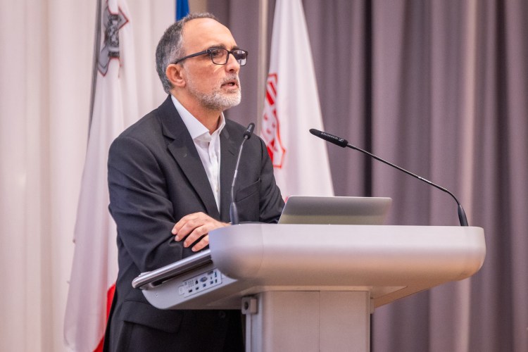 Fid-diskors tiegħu, is-Sur John Paul Grima, riċerkatur u lettur każwali fid-Dipartiment tal-Malti tal-Università, għamel diskors bl-isem ta’ “Lejn ġabra ta’ riżorsi terminoloġiċi bil-Malti: l-ikel u t-tisjir”, imsejjes fuq teżi tal-Masters fil-Lingwistika Maltija dwar It-Terminoloġija Maltija: Lejn Ġabra ta’ Riżorsi Terminoloġiċi bil-Malti (2024) li tmexxiet mill-Prof. Michael Spagnol. John Paul Grima ppreżenta mappa tar-riżorsi terminoloġiċi bil-Malti li nħadmu mis-seklu dsatax ’il quddiem, imma saru b’għanijiet u metodi differenti. Din il-mappa toffri punt ta’ riferiment għal dawk kollha li fuq il-post tax-xogħol, fl-istudju jew fir-riċerka tagħhom ikunu qed ifittxu t-terminoloġija bil-Malti. Din il-mappa tinkludi stampi, recordings awdjo, u filmati.
