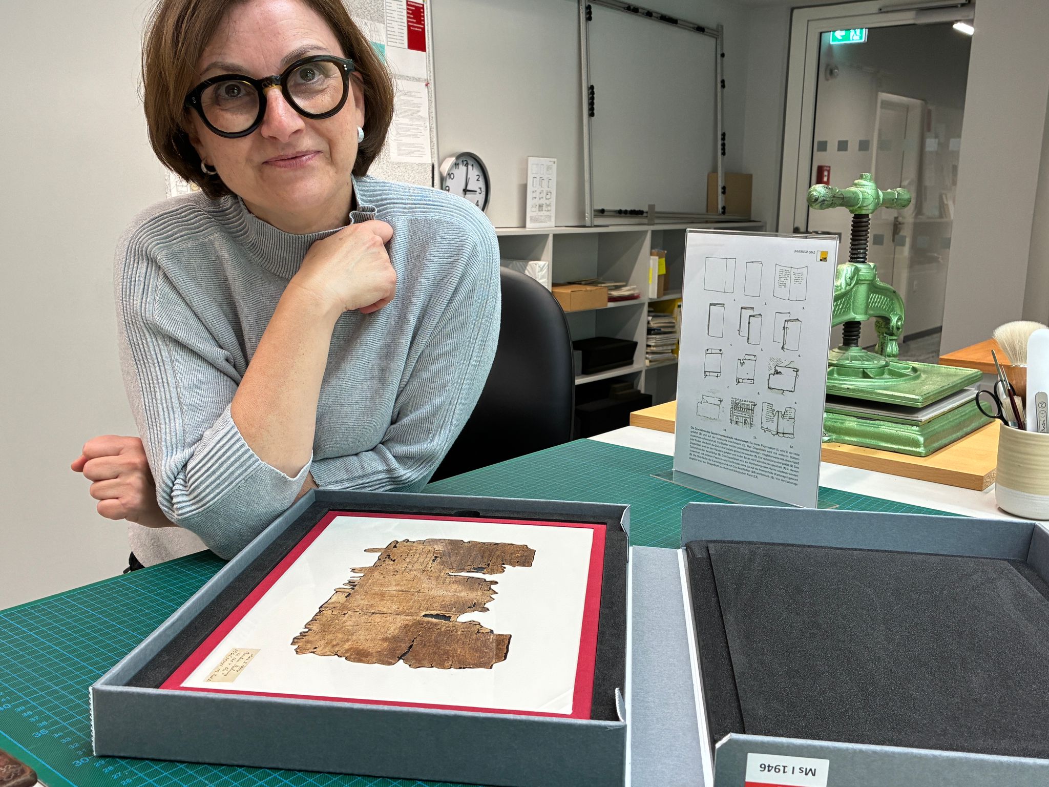 Waqt li kont l-Università ta’ Graz fl-Awstrija għal żjara ta’ riċerka u kollaborazzjoni ta’ ġimgħa fit-tielet ġimgħa ta’ April 2026, il-Kap tad-Dipartiment tal-Konservazzjoni, Dr Theresa Zammit Lupi, stednitni biex inżur il-librerija u d-dipartiment tagħha u wrietni l-papiru mis-sena 260 QEK fl-arkivju tal-Università li juri li l-istorja tal-ktieb (jew il-verżjoni bikrija tiegħu, il-codex) hija bejn 300 u 400 sena iktar qadima milli konna naħsbu. Din l-istorja tal-għaġeb li xxandret fl-2023 u tat prominenza kbira lill-kollega tagħna u x-xogħol li jagħmlu hi u sħabha, hija rrakkontata fost l-oħrajn hawnhekk, imma llum kelli x-xorti nara b’għajnejja dan il-framment u nisma’ mingħand Dr Zammit Lupi l-istorja ta’ kif għamlet l-iskoperta tagħha.