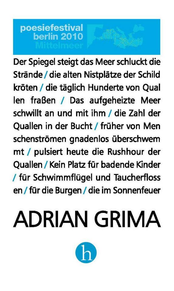Adrian Grima was invited to read at the XI edition of the prestigious poesiefestival berlin in June organized by Literaturwerkstatt at the Akademie der Künste in Berlin. He read nine of his poems in Maltese which were translated into German from the original by Ray Fabri and Dominik Kalweit and edited by the German poet Sylvia Geist.