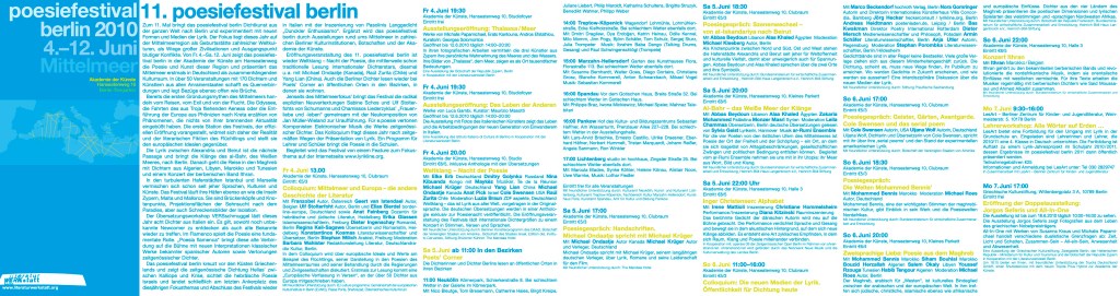 For the 11th time, the poesiefestival berlin is bringing poetry from around the world to Berlin and experimenting with new forms and media for poetry. The focus this year is on the Mediterranean region, as the birthplace of many of the world’s cultures, the cradle of great civilisations and flashpoint of bloody conflicts, From Friday 4 to Saturday 12 June 2010, the poesiefestival berlin will be presenting the poetry and art of this region in the Akademie der Künste in Hanseatenweg and, for the first time in Germany, showing in more than fifty events featuring 150 poets and artists from all of the countries bordering on the Mediterranean how the cultures of the region cohere, creating cross-cultural links and revealing their cohesions as well as their fractures.